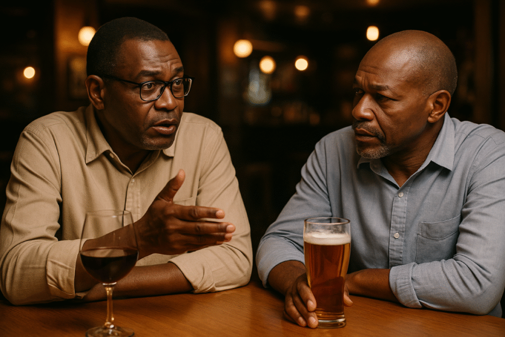 Le soleil descend lentement sur Johannesburg, il est 18h30. La ville s’agite encore, mais dans le bar du quartier de Rosebank, deux hommes échangent tranquillement à voix posée, les verres posés devant eux. Ce sont Kazadi et Mulumba, deux Congolais installés de longue date en Afrique du Sud. L’un est cadre dans une banque internationale tandis que l’autre s’occupe comme un technicien supérieur dans le secteur du bâtiment. Ils sont à la veille d’une étape cruciale de leur vie : la retraite.